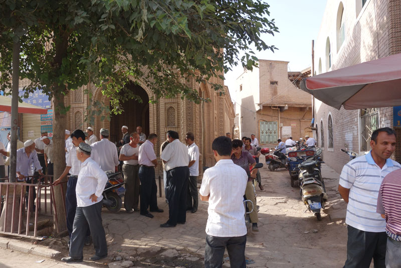 礼拝を終えた男性たちがモスクからちょうど出てきたところでした。