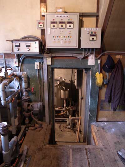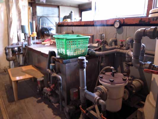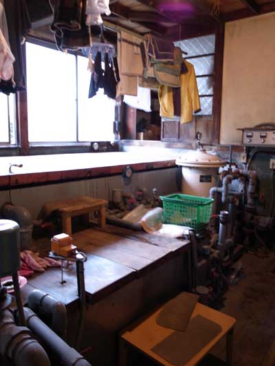 パイプ。写真には撮っていませんが、このような大小のパイプが床下を張って、先に掲載した浴槽まで送られていくそうです。
