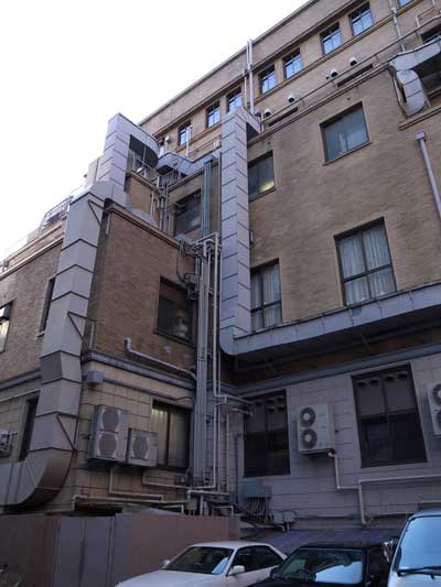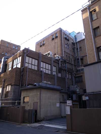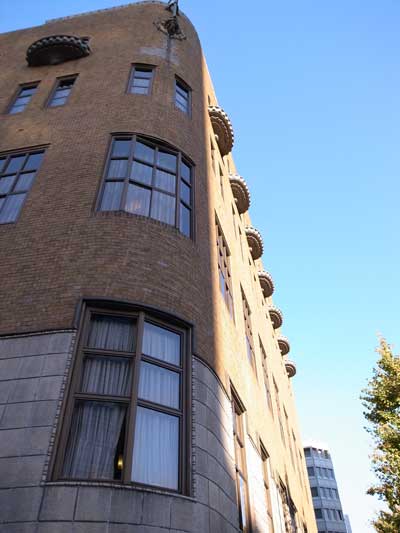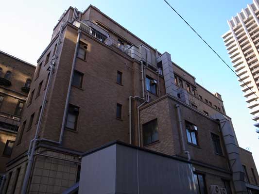 側面から。最上階の窓や丸まった角の雰囲気が、時代を感じさせます。