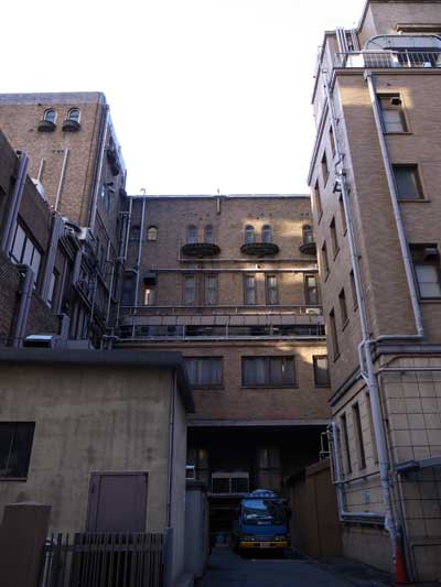 学士会館、なかなか年代物のようですね。何気にすみっこのあの角度、好きです。入り口のアーチもいいですね。搬入口もなかなか…。