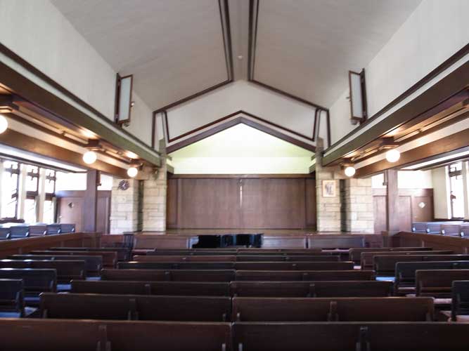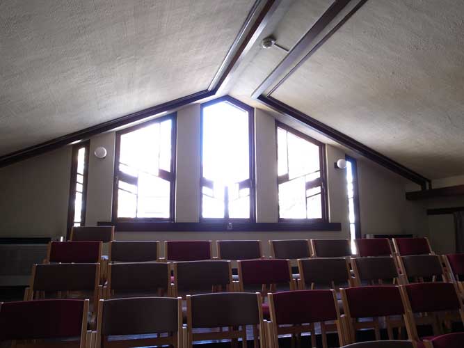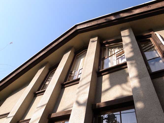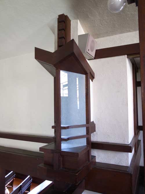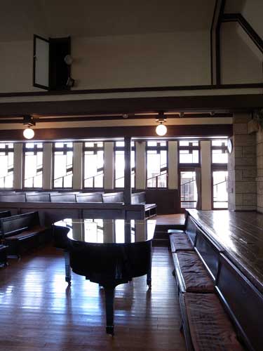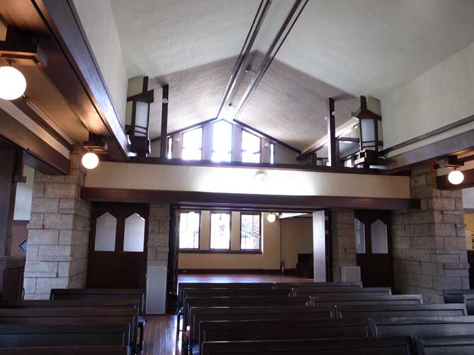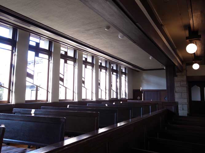 ちなみにライト氏の建築は、会社にあった旧帝国ホテルの写真集で知って以来、すごく好きになりました。この自由学園は帝国ホテルと比べるとずっとシンプルなんですが、それが逆に魅力というか、すばらしい空間だなぁと感じました。