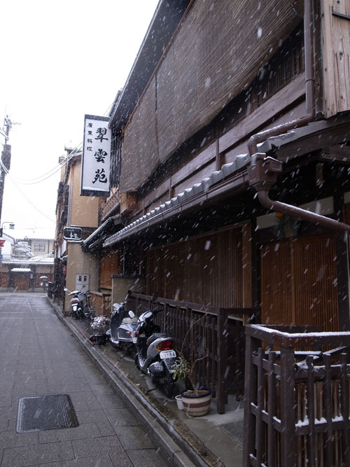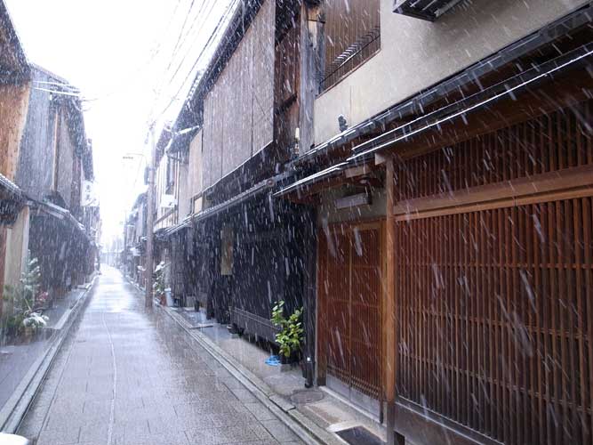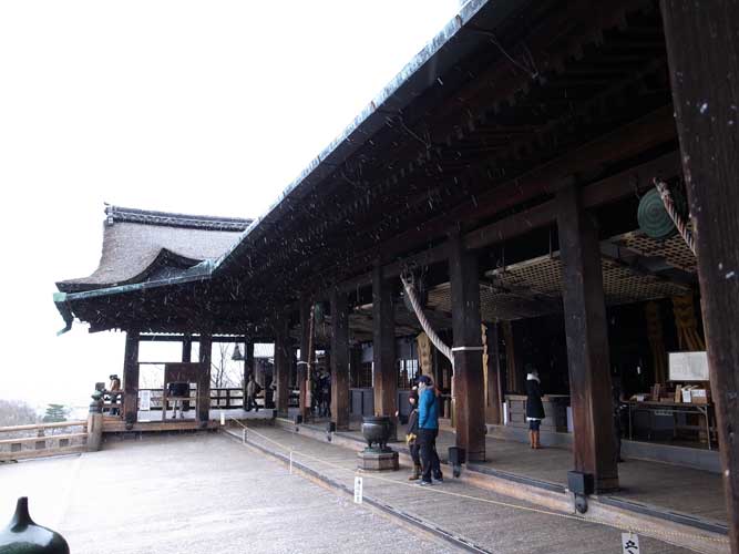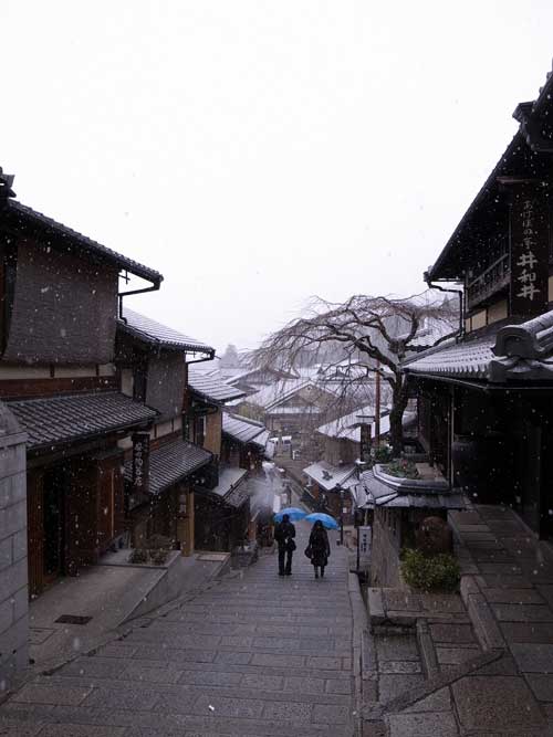 こちらは清水寺の付近。午前8時過ぎ。雪の降り始めです。