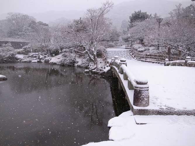 橋も真っ白に。ちなみにこの公園で強烈な腹痛に教われましたが、ちょうど目の前にきれいなトイレがあって助かりました。きっと清水寺のご利益です。