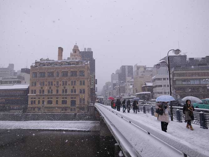 鴨川、四条の大通り。まだお昼前でしたが、どこを見渡しても真っ白、カメラを構えるのも難しいくらいの吹雪になっていました。