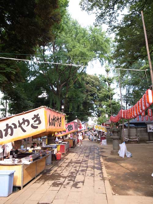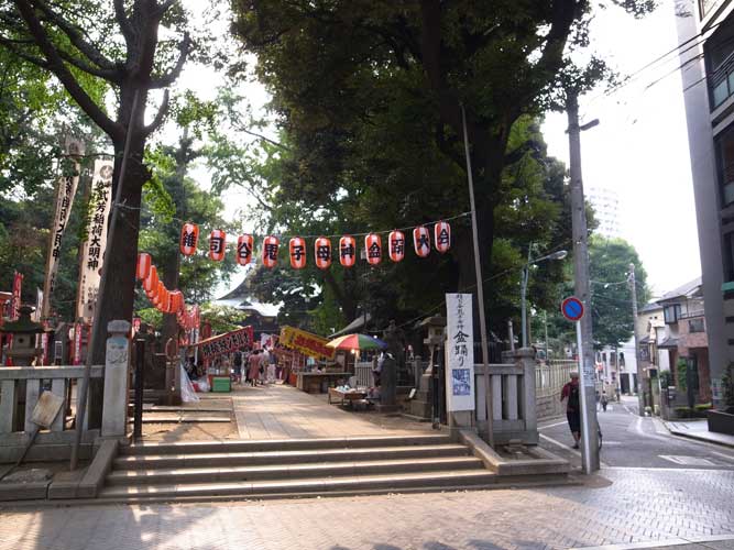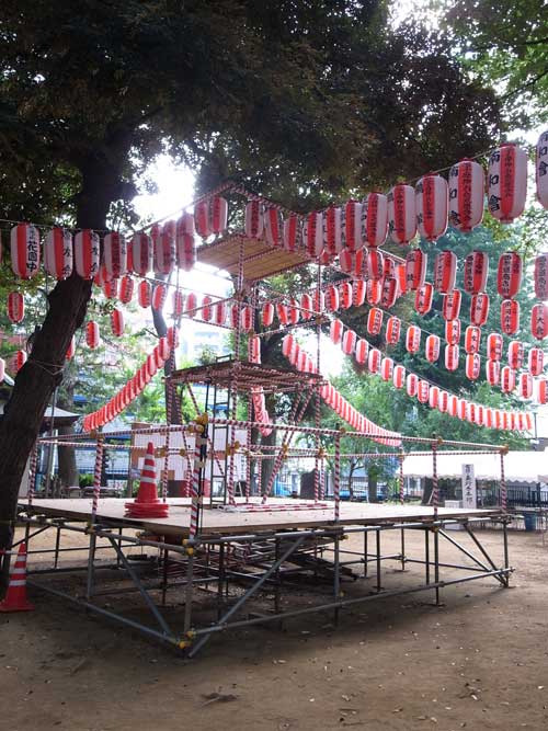 鬼子母神。この日は盆踊りと縁日が出ていて、準備中でした。
