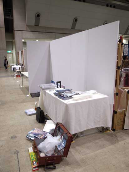 土曜朝、会場についた直後。前回5月のときは1スペースでしたが、今回は大き目のポスターを貼りたかったので2スペース借りてみました。(床面のテープの範囲が1スペース)。