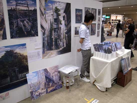 営業中の図。画面下に立てかけてあるのが、前回一番大きかった展示品(B3)なので、それと比べると大分大きく、目立つものになりました。ちなみに立っているのは私本人です。。