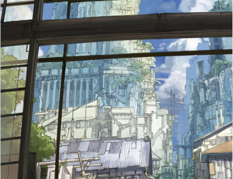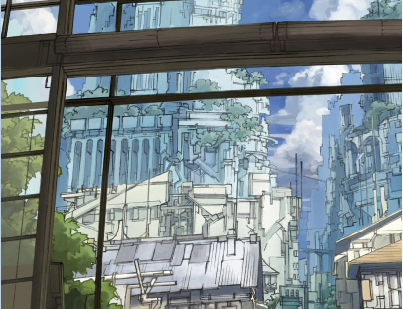 光の調節、ふち部分のハイライトの追加、空の色の調節を行います。彩度を落としたことで、手前とのなじみがよくなった・・・気がします。