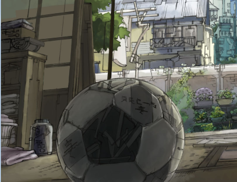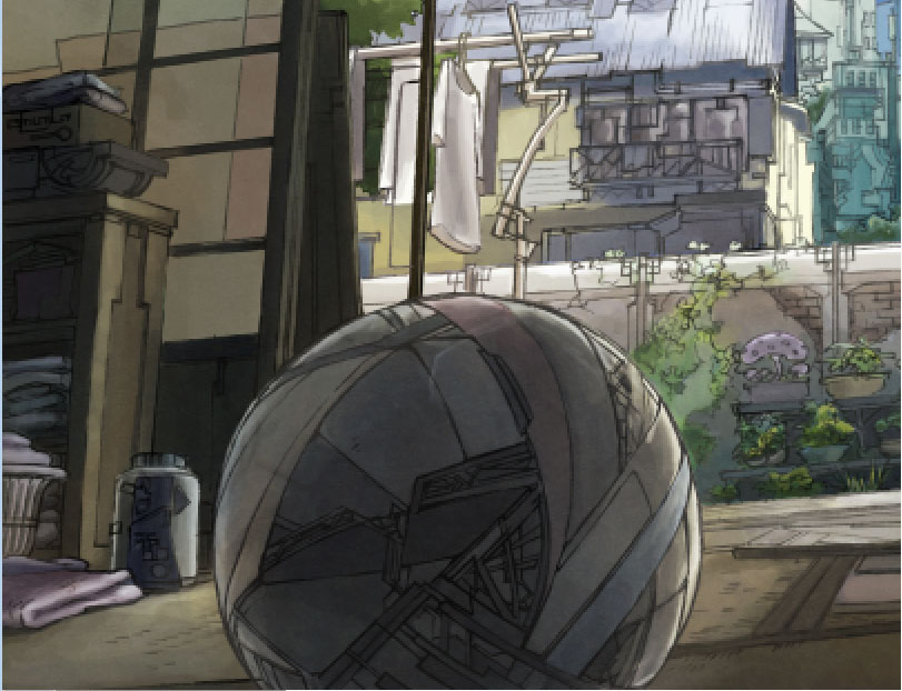 未来感あふれる不思議なボールに大改造。さすがにこれはPhotoshop上では無理だったので、紙で描きなおしたものを、切り取って重ねなおしました。後からこういう修正をするのはなかなか骨が折れるのですが、気になってしまったので仕方ありません。