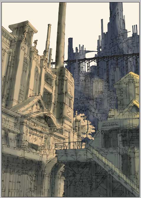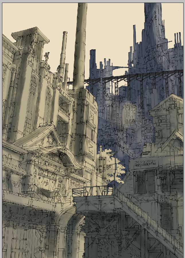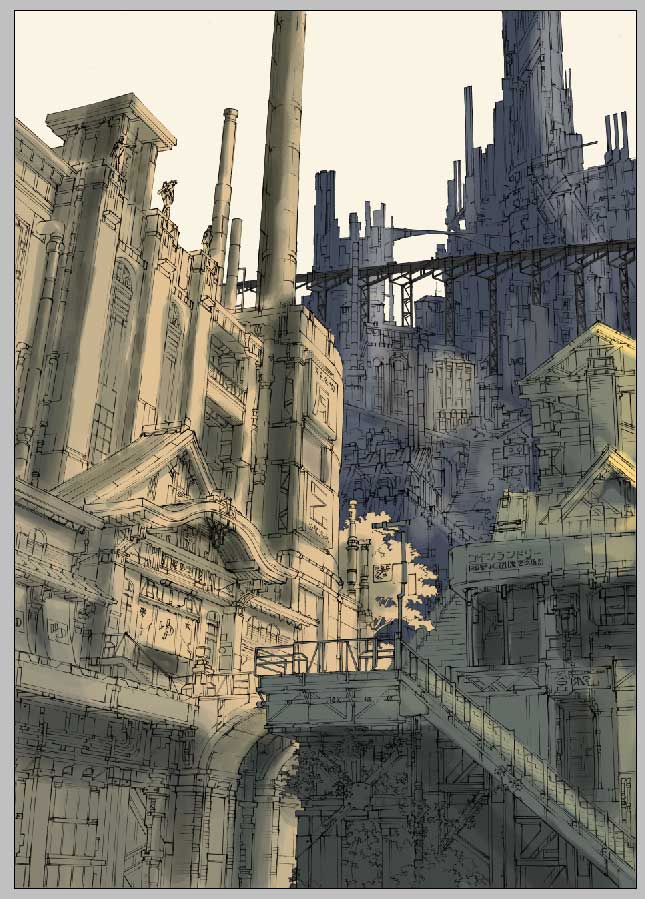 さて、先日線画をアップしました大銭湯と百の階段の街、色塗りの過程を少々保存していましたので、ざっくりとではありますが、久しぶりに紹介してみたいと思います。