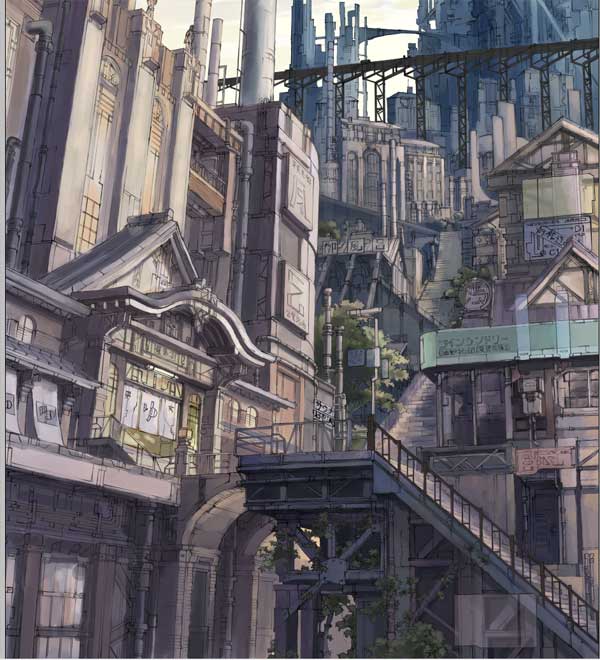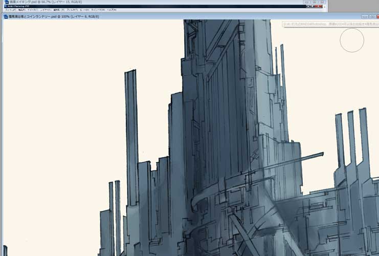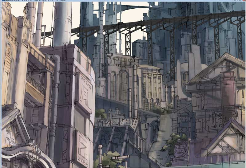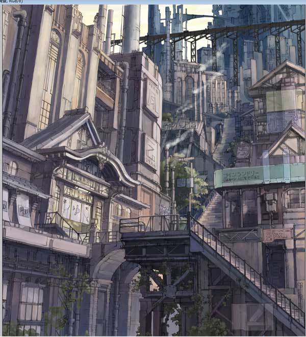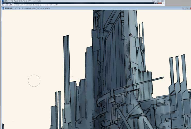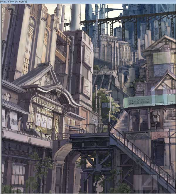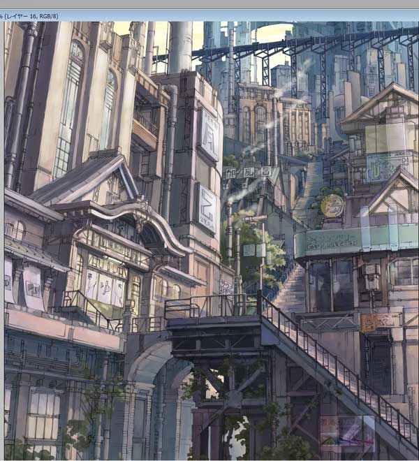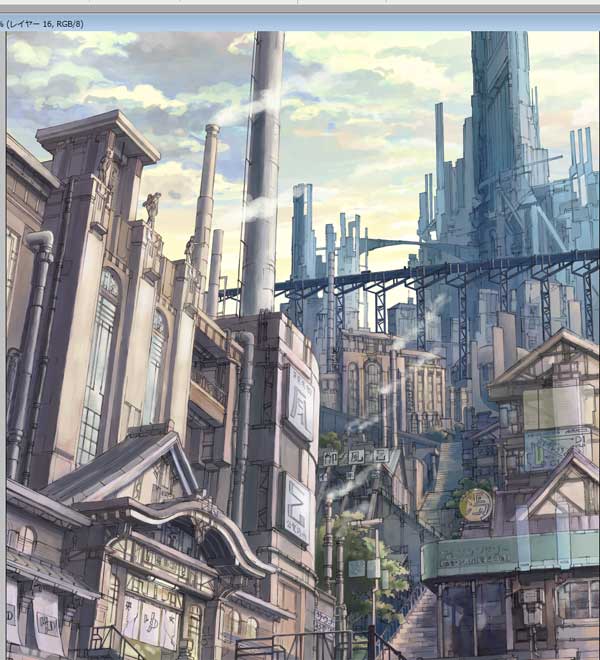 上側。奥に行くにつれて青っぽくしてありますが、このへんはオーバーレイやソフトライトなどのレイヤーを何枚も重ねています。