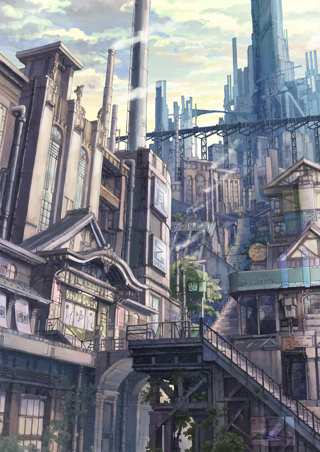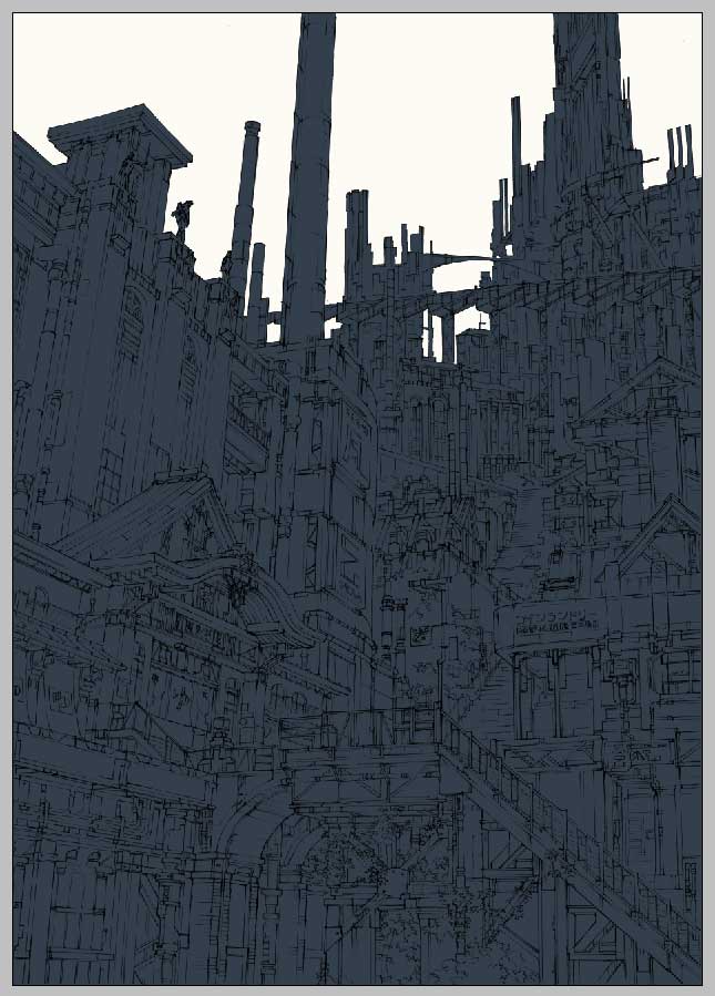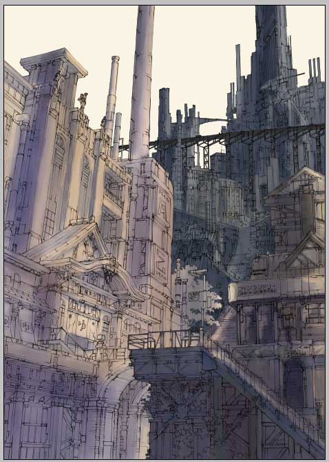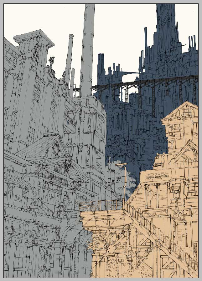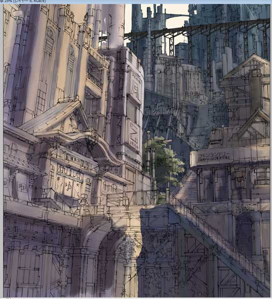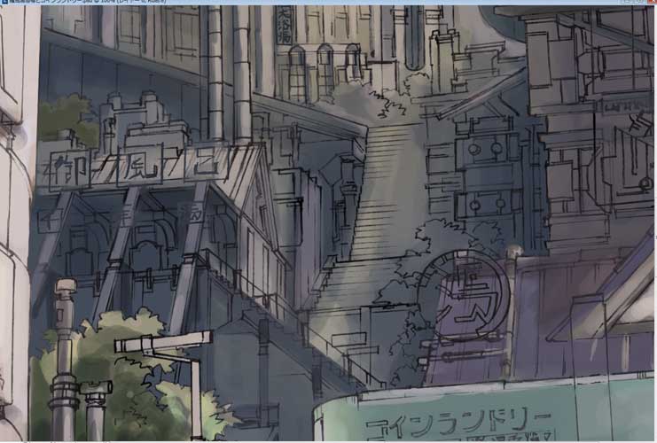 さて、先日線画をアップしました大銭湯と百の階段の街、色塗りの過程を少々保存していましたので、ざっくりとではありますが、久しぶりに紹介してみたいと思います。