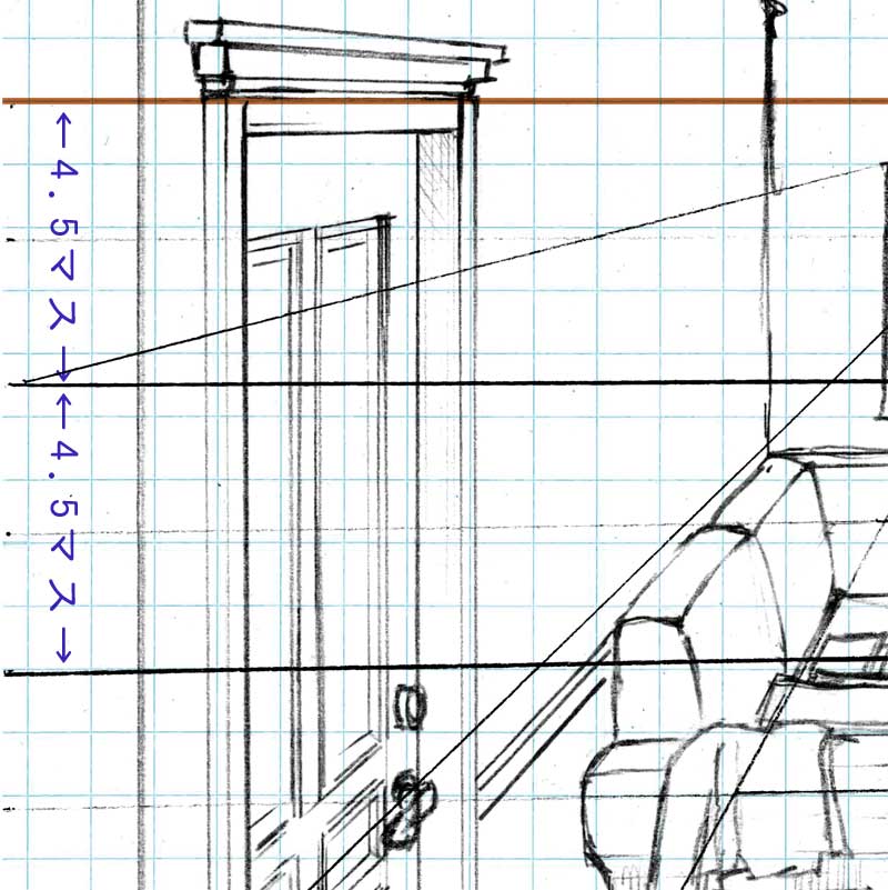 私が作図をする際には、まず茶色のラインのように水平線を置いてから、その上下にガイドとなるパース線をうっすらと、ほとんど見えない程度濃さで描きいれてからそこに絵をはめ込んでゆく、というスタイルで進めています。