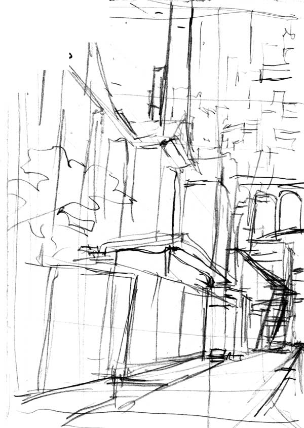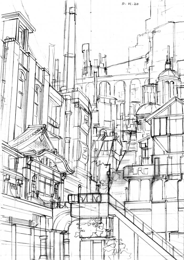 仕事で途中まで描いたものの、指示されていた内容とかなり異なっていたことに途中で気づき、泣く泣くボツにした設定画を、それなりのところまで加筆したものです。ちょうど二点透視図法で描いているので説明にぴったりということで。