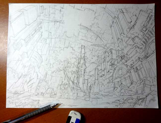 パースのきつい部分では、たとえ絵中で一ミリの歪みでも、展開して考えた場合には、かなりの歪みになってしまうからです。