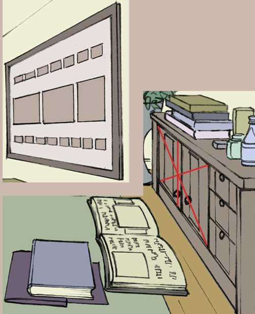これは絵中の本や額の部分にも同じことが言えますし、街並み等を描く際にも当てはまることが結構あるかと思います。