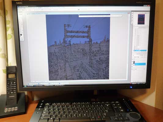 そして送電塔の下を走る列車の線路にも色を置いてゆきます。