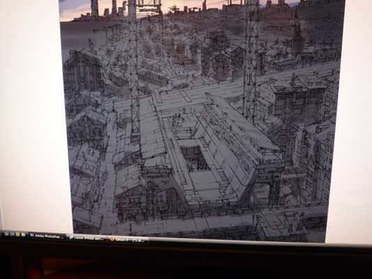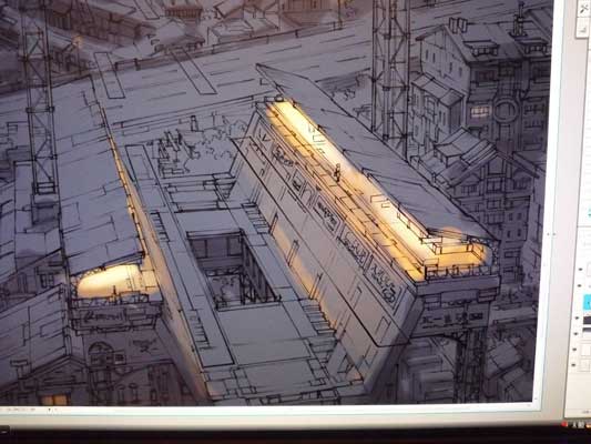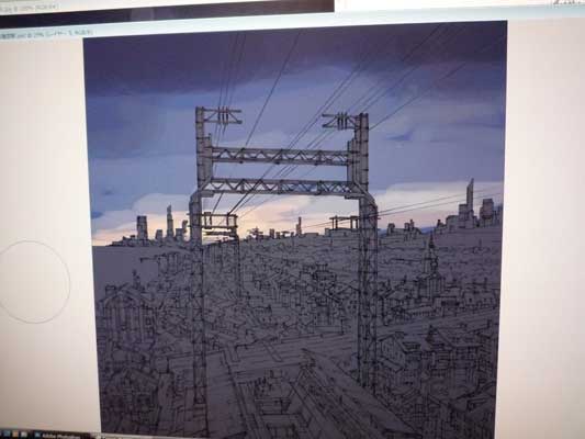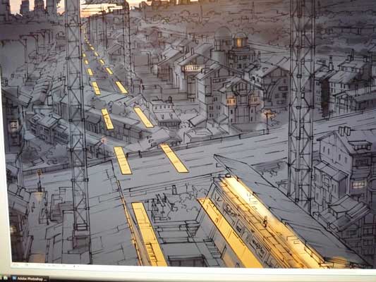 空に合わせて街にも影をつけてゆきます。この絵の場合画面中央奥が光源なので、非常にわかりやすいです。