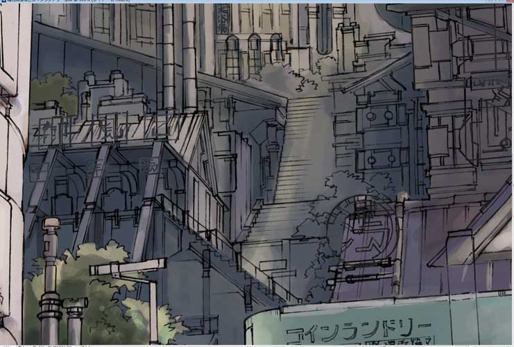 さて、先日線画をアップしました大銭湯と百の階段の街、色塗りの過程を少々保存していましたので、ざっくりとではありますが、久しぶりに紹介してみたいと思います。